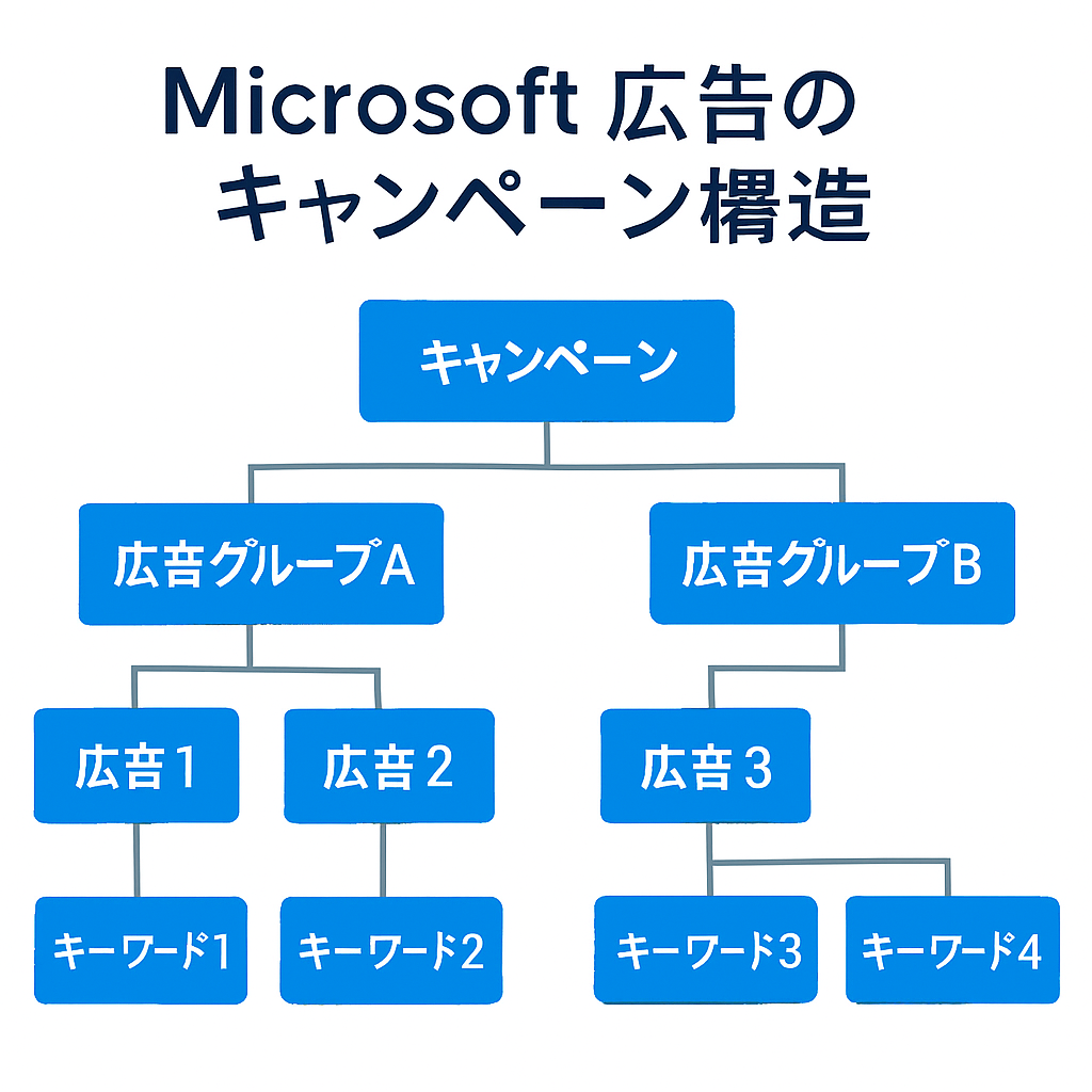 Microsoft広告を始めたばかりの方にとって、「キャンペーン」「広告グループ」「広告」「キーワード」の関係は少し複雑に感じるかもしれません。この記事では、図解を用いてその構造をわかりやすく解説し、最適な設計方法を紹介します。